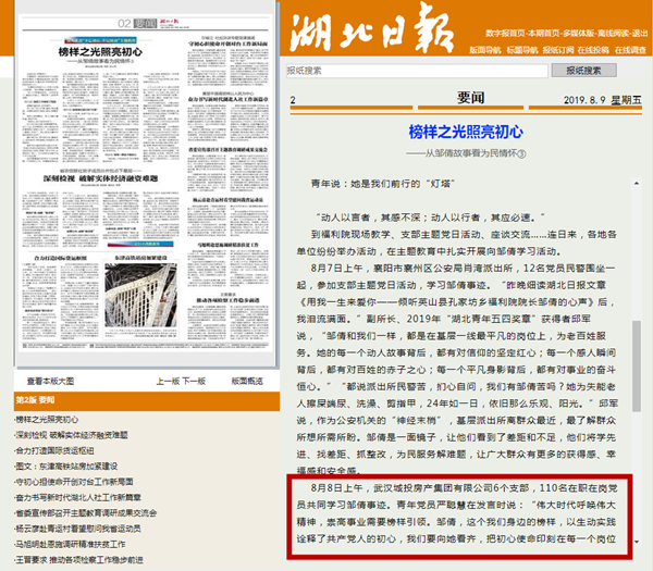 8月9日,《湖北日报》第2版要闻“深入推进‘不忘初心、牢记使命’主题教育”专栏,对房产集团公司党员集中学习邹倩同志先进事迹活动进行了报道。